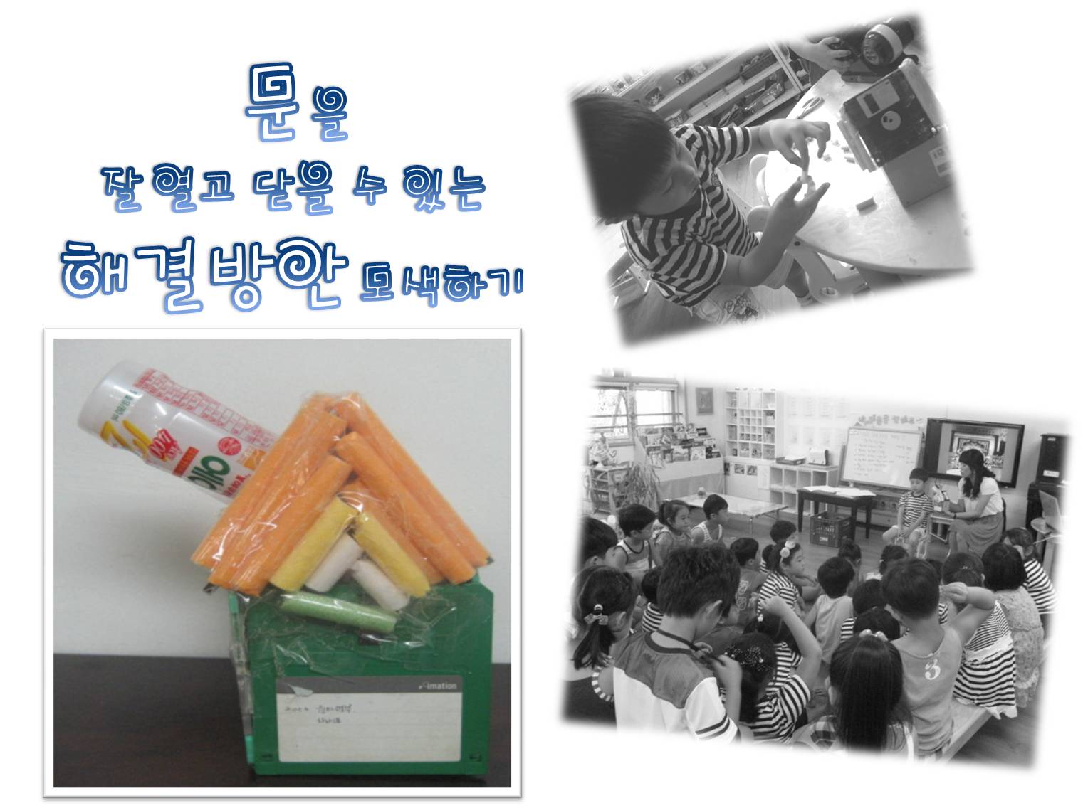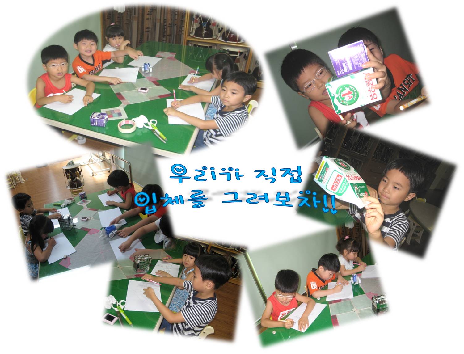 <집만들기- 굴뚝에 대한 궁금증> 조형영역에서 한 유아가 플로피디스켓을 이용해 집을 만들던 중에 문제점에 부딪히게 됩니다. “선생님, 집에 문이 잘 안열려요. 수수깡을 붙이려면 테이프를 붙여야 하는데 테이프 때문에 자꾸 안열려요. 교사: 이 문제점에 대해 다른 친구들로부터 좋은 생각을 들을 수 있지 않을까? 그렇게 해서 나눔시간을 통해 문제점을 해결할 수 있는 방법을 모색하게 됩니다. 유아2: 투명테이프는 수수깡과 다른 부분을 함께 붙여야 붙여지지만 양면테이프를 이용하면 수수깡에만 끈적한 부분이 붙기 때문에 더 좋을 것 같아. 유아4: 손잡이가 없어서 열고 닫기가 조금 불편할 것 같아. 밖에다 종이 같은 것을 동그랗게 말아서 손잡이를 붙여주면 열고 닫기 좀 더 편할 것 같아. 그때, 한 유아가 궁금한 점을 질문합니다. 유아5:그런데 굴뚝은 왜 있어? 유아1: 원래 집에는 굴뚝 있잖아. 유아6: 우리 집에는 굴뚝 없는데? 대부분의 유아들이 자신의 집에서 굴뚝을 본 적이 없다고 이야기 하는 도중... 유아7: 우리 집은 아파튼데도 굴뚝 있었어요. 옥상에 길쭉하게 생긴 것 본 적 있어요. 유아1: 그런데 옥상에만 굴뚝이 있으면 1층이랑 2층에서 나는 연기는 어떻게 빠져 나가? 유아8: 현관문을 통해서 나가겠지? 유아9: 창문도 있잖아. 유아10: 가스레인지 위에 보면 요리할 때 엄마가 열어서 연기가 빠지게 하는 것이 있거든요. 그게 하수구 같은 길이랑 연결되어 있어서 옥상까지 갈 수 있는게 아닐까요? 우리 집에도 굴뚝이 있을까요? 굴뚝이 없다면 집에서 나는 연기는 무엇을 통해 밖으로 나갈 수 있는 걸까요? 주말 동안 잎새반 친구들과 함께 이야기 나누어 보시는건 어떨까요?<자동차 만들기> 평면을 입체로 표현하기 전 각 부분을 먼저 그림으로 표현해 봅니다. 유아1: 옆모습은 양쪽이 같아요! 그래서 한 개만 만들면 될 것 같아요. 유아2: 위에서 보았더니 그냥 네모 모양이예요! 유아3: 앞에서 보아도 네모 모양이예요! 그런데 자동차의 앞면, 옆면, 윗면, 아랫면의 모습을 모눈종이에 옮기다 보니 문제점에 부딪치고 맙니다. “입체로 그릴려니까 잘 모르겠어!” 옆에서 본 모습은 자신들의 생각을 넣으면 되지만 앞에서 보았을 때, 위에서 보았을 때엔 그저 직사각형의 모습인 것을 유아들은 이해하지 못합니다. 각자 빈 우유곽으로 만든 자동차를 보며 앞면, 옆면, 윗면, 아랫면을 그려 친구들 것과 비교해 본 유아들은 서로가 다르게 표현한 부분에 대한 의문을 가지게 됩니다.