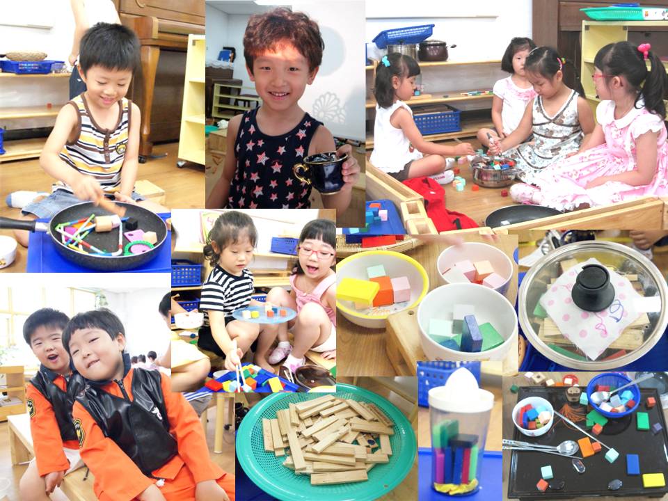 아이들은 여러 가지 모양과 색깔의 가베를 열심히 탐색하고 가베라는 매체로 표현할 수 있는 이야기를 화지 속에 펼쳤습니다.