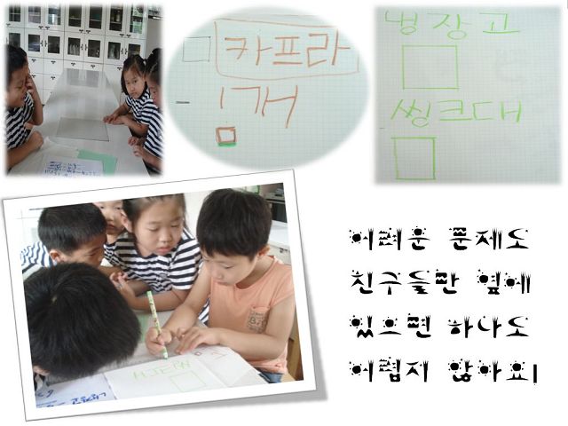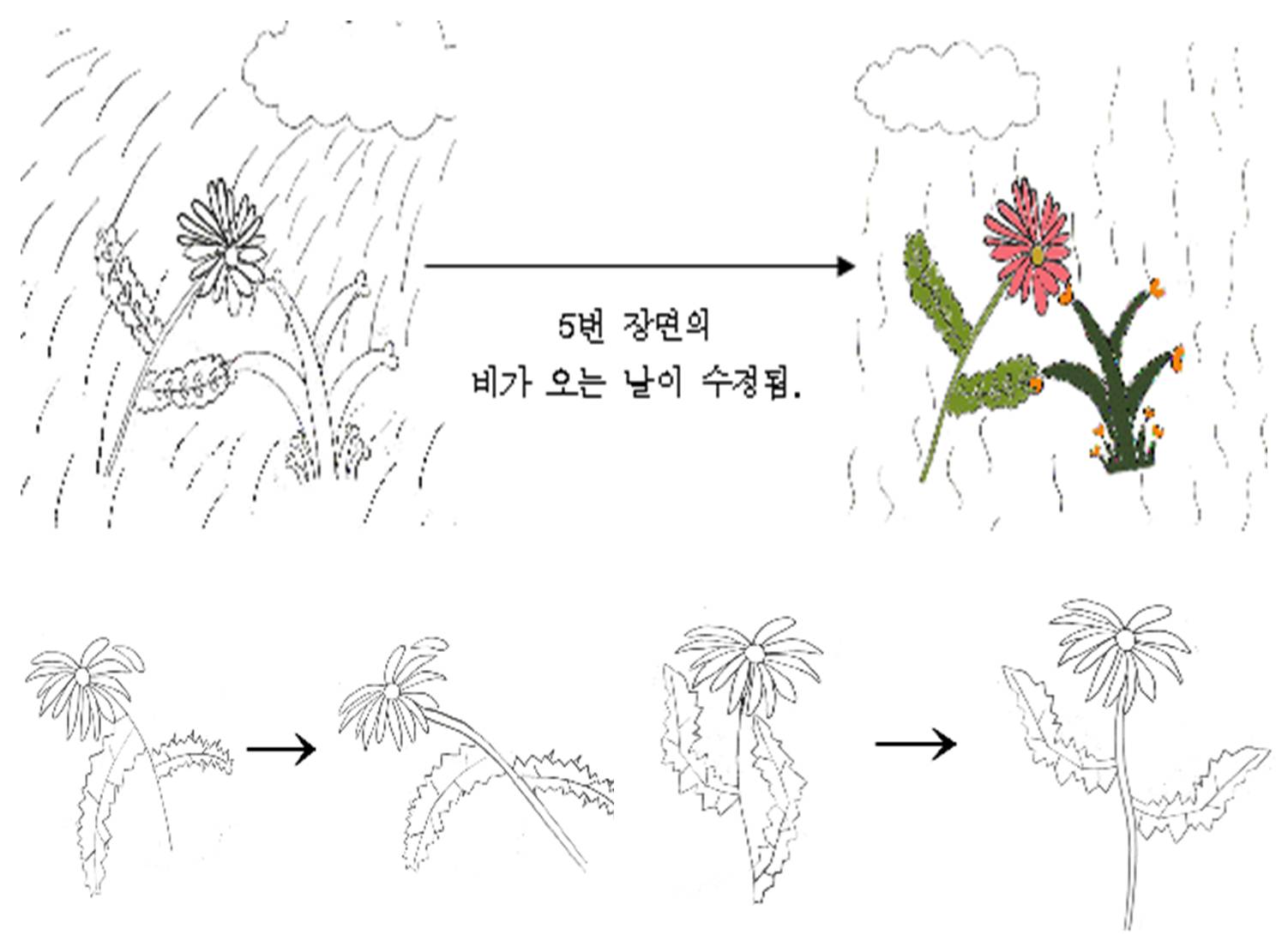 T: 우리 동화는 모두 같은 날 일어난 이야기일까? C:아니에요. C: 마지막 장면은 다른 날이에요. C: 비가 오다가 그쳤다가 다시 오는거니깐. C: 어! 그러면 비가 오는 모양이 똑같으면 안되는데... C:5번 장면의 비는 다르게 바꾸자. T: 민들레가 얕보는 것 때문에 속상한 풀이 처음엔 민들레 손을 잡아주지 않았지? 그건 어떻게 생각해? C: 화가 나면 그럴 수 있어요. T:하지만 처음부터 풀이 민들레 손을 잡아준다면? C: ... C: 그게 훨씬 더 멋져요. C: 풀은 정말 멋진 친구에요. C: 마음이 깨끗하게 청소되는 것 같아요. C: 마음이 편안해져요. 생각을 충분히 주고 받는 대화를 통해 동화를 좀 더 수정해 나갑니다.# <행복한집> 팀이 알아낸 다양한 길이를 모눈종이에 축소시켜 보았습니다.