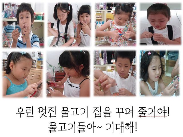 T: 카프라 1개를 모눈종이 몇 칸으로 했으면 좋겠어? C: 2칸! C: 그래. 두칸으로 하자! 한칸은 너무 작으니까. C: 얘들아! 모눈종이 2칸은 1cm야! C: 그럼 카프라 1개가 1cm야? C: 음... 맞아! C: 카프라 5개는 5cm고, 카프라 10개는 10cm야? T: 맞아! 너희가 줄이는 방법이 바로 ‘축소’라는 거야. C: 축소? 조금 어려운 것 같아. C: 봐봐! 1개는 1cm니까 3개는 3cm잖아. C: 아! 알겠다! 그래서 카프라 10개는 10cm구나. 행복한집 팀은 직접 재어본 길이를 모눈종이에 다시 축소 시켜보았습니다. 아무리 어려운 문제가 생겨도 친구들이 옆에서 도와주니 금방 해결되고, 또 다른 문제를 함께 고민해 봅니다.# <물고기집>팀은 물고기집 안에 넣어 줄 모형들을 그림을 보면서 만들어 보았습니다.