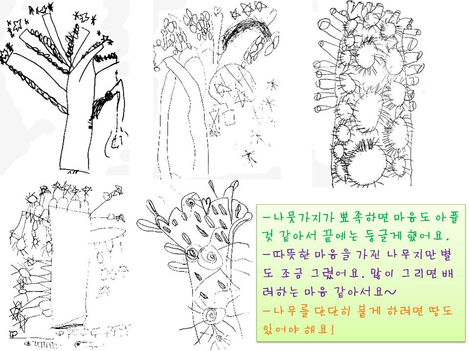 -나뭇잎이 붕붕 떠있어서 나뭇잎인지 잘 모르겠어. 나뭇가지에 붙여서 그리면 좋을 것 같아. -나뭇가지 끝에 왜 하트가 있어? -배려하는 마음을 가지면 기분이 좋아서 하트가 생기는거야. -해가 너무 많이 있어서 거미 같아~ 지우면 더 멋지겠는데? -저건 뭐야? -샤워기~ -샤워기가 너무 짧아서 샤워기 안 같아. 조금 더 길게 그리면 샤워기 같을 거야.
