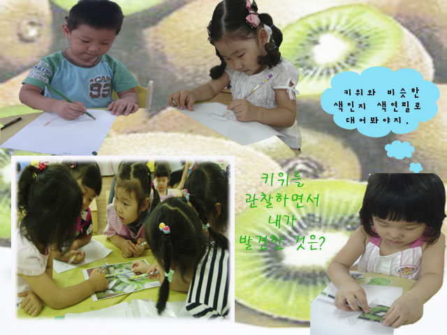 “키위는 연두색이예요. 여기 흰색도 있어요.”
