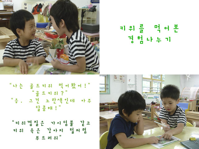 “나는 노란키위 먹어봤어요.” “골드! 골드는 위에는 쌔그럽고 밑에는 달콤해요. 꿀 맛 이예요.” “키위는 딸기 맛 이예요. 딸기처럼 씨가 많이 들어 있잖아요.”