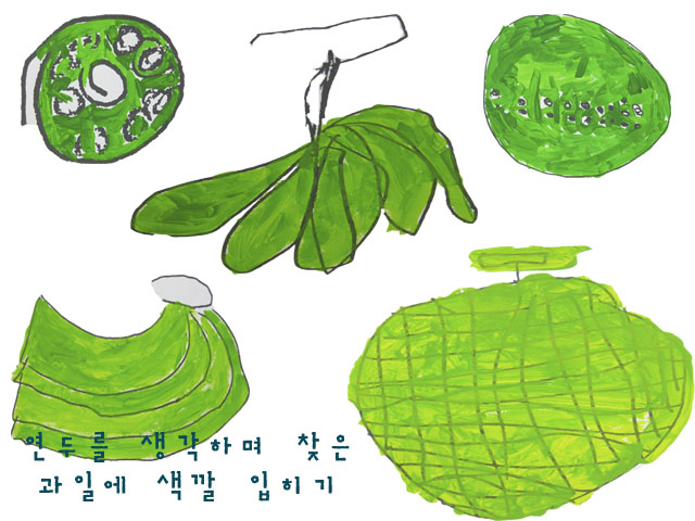 “나는 메론을 먹어봤는데 조금 시었어요.”유아들은 서로의 경험을 나누며 살펴본 과일을 그림으로 그려본 후 우리가 함께 만든 연두색 중 과일의 색과 가장 비슷한 색을 찾아 칠해 보는 경험을 가집니다. <연두>라는 추상적인 색을 과일이라는 구체물에 대입시켜 색에 대한 이해를 도와줍니다.