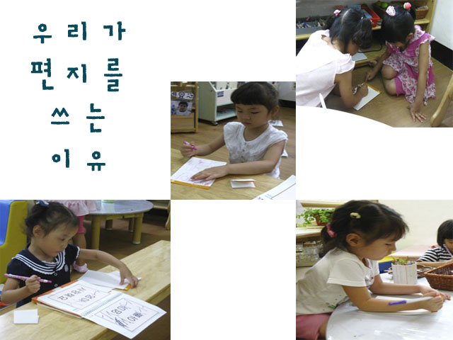 새싹반 친구들은 <연두>를 탐색 해 가는 과정 속에서 여러 가지 가설을 세우고 실험하는 과정을 거칩니다. 이러한 과정 가운데 실험정신을 가지게 되었으며 나의 생각 뿐 아닌 서로의 생각을 듣고 나누며 생각을 확장해 나갑니다. 유아들은 연두를 탐색하는 동안 색에 대한 민감성 그리고 연두 속의 다양한 연두가 있다는 <색의 계열>에 대한 이해도 가졌으리라 생각합니다.<우리가 편지를 쓰는 이유>