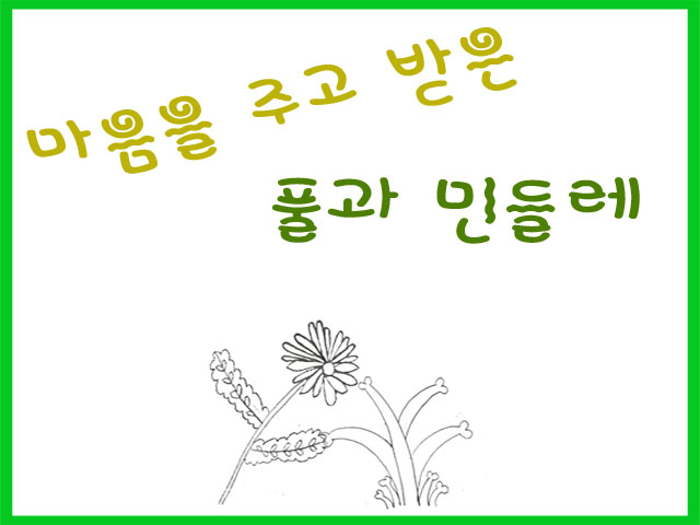 #<친구>팀은 동화의 제목을 결정하기 위해 모였습니다. T:친구들이 이 동화를 듣고 나면 어떤 마음이 들었으면 좋겠어? C:민들레가 아름답다는 것? C:그건 아니야. 민들레처럼 살면 안된다. C:풀처럼 다른 사람을 대해야 된다. T:그럼 동화의 제목은 동화책에서 어떤 역할을 할까? C:제목이 재미있어야 동화책을 사요. C:제목이랑 그림도 있어야 되요. C:제목이 중요해요. T:그럼 우리 동화의 제목은 무엇으로 하면 좋을까? C:손을 잡아준 민들레 C:민들레를 멋지게 만들어 준 풀 C:친구가 된 민들레와 풀 C:착한 마음을 주고 받은 풀과 민들레 C:민들레를 살려준 풀 C:마음이 통한 풀과 민들레 T:이 중에 어떤 제목이 좋을까? 아이들이 말한 제목 중에서 마음이 따뜻한 것이 느껴지는 ‘마음을 주고 받은 풀과 민들레’가 결정되었습니다.