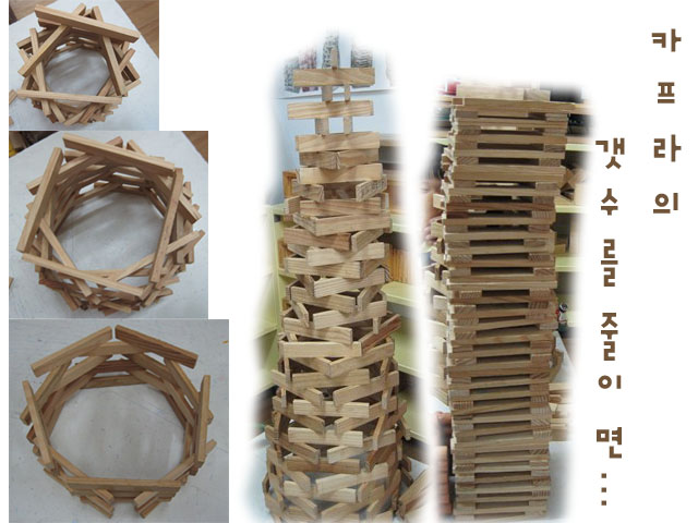 #<카프라 탑>팀은 탑의 모양의 아래에서 위로 점점 좁아지는 형태를 만들어봅니다. T:어떻게 하면 진짜 탑 모양처럼 점점 좁아지게 할 수 있을까? C:좁게 좁게 붙여요. C:가깝게 놓아요. C:카프라 개수가 줄어들면요? T:그러면 탑이 점점 좁아질까? 한 번 해 볼까? 아이들은 처음에 놓은 카프라의 개수를 한 개씩 줄여가며 탑이 점점 좁아지도록 구성합니다. C:좁아진다. 좁아진다. C:그런데 카프라를 한 개 줄일 때 조심해야된다. 탑이 무너질 수도 있어. C:처음에 카프라를 5개씩 놓고 한 개씩 줄일 때보다 6개씩 놓고 한 개씩 줄일 때 탑이 더 크다. T:왜? 왜 그렇지? C:카프라 수가 더 많으니깐 더 넓잖아요. 넓으면 더 커요.