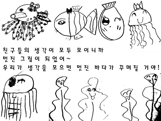 T: 친구들이 그린 그림들이 바다 속에 사는 것들 같니? C: 아니야. 미역에는 중간에 선이 있어야 돼! C: 물고기 눈이랑 입은 앞으로 조금 튀어나와야해. 지느러미도 있어야지~ C: 문어 얼굴에 코가 동그랗게 튀어나와야해! 먹물이 나올 수 있게. C: 조개는 벌어지는 곳이 입이 되잖아. C: 난 소라를 본 적 없어서... C: 비슷해~ 소라 위에는 조금 둥글면서 뾰족하게 생겼어. C: 밑에 꼬불꼬불해야 진짜 해파리 같을 거야.