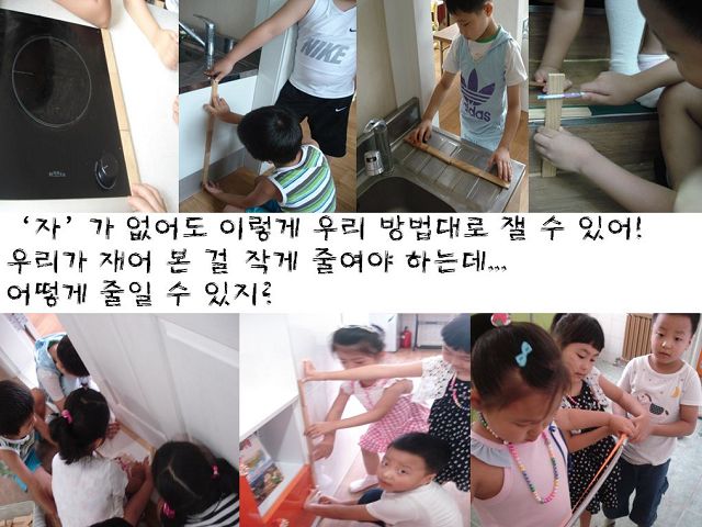 친구들이 그린 그림에서 자신이 알고 있는 지식들을 이야기 하며, 고쳐나갈 수 있게 되었습니다. 멋진 바다 속이 되기 위해 함께 고민해 봅니다.# <행복한집> 팀이 3번째 집 모형을 만들기 위해 이번에는 실제 물건들을 재어 보았습니다.