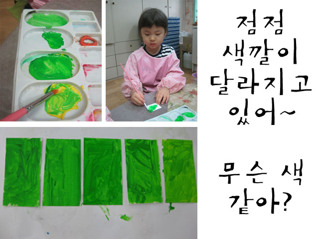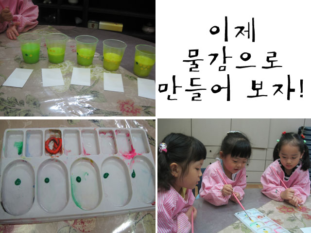 지난시간 물의 양은 일정하게 하고 약통에 초록과 노랑색 물을 담아 일정 양을 떨어뜨려 섞어보고 스티커로 그 양을 가시화하는 활동이 이루어졌습니다. 이번 주는 물감과 붓을 사용하여 다섯 가지의 <연두카드>를 만들어보았습니다. “나는 초록 하나 노랑 하나” “나는 노랑 둘”.. 초록하나 노랑 다섯까지의 유아들이 순서를 정해 각각 유아들이 붓을 하나씩 들고 색을 섞어봅니다.
