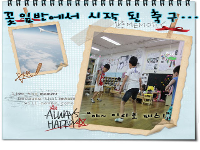 - 대한민국 팀과 스페인 팀으로 구성된 꽃잎반의 축구팀! 골키퍼와 공격&수비를 동시에 담당하는 축구 선수가 있습니다. 상대편으로 공을 몰고 가서 차는 선수들~ 하지만 어쩐지 축구 골대는 없는 것 같습니다.