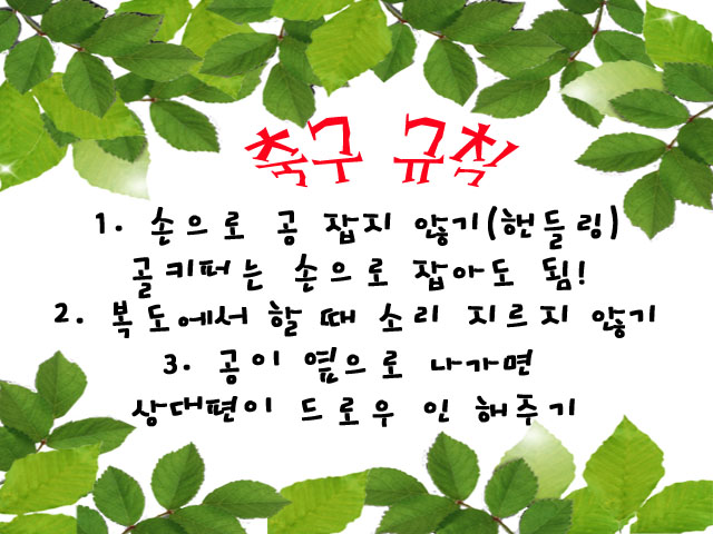 - 아이들이 머리를 맞대고 나름대로의 축구 규칙을 만들어봅니다. 아직 모르고 있는 축구 규칙들은 차차 만들어 가면 되겠죠?