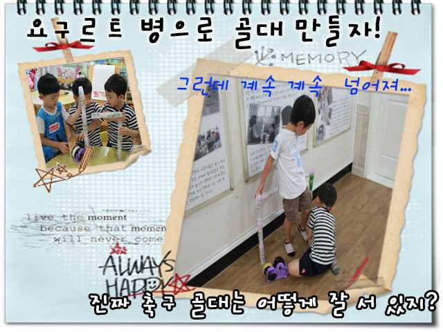 - 아이들의 의견을 모아 요구르트 병으로 축구 골대 만들기에 도전합니다. 하지만 어째서인지 계속 계속 넘어지고 맙니다.