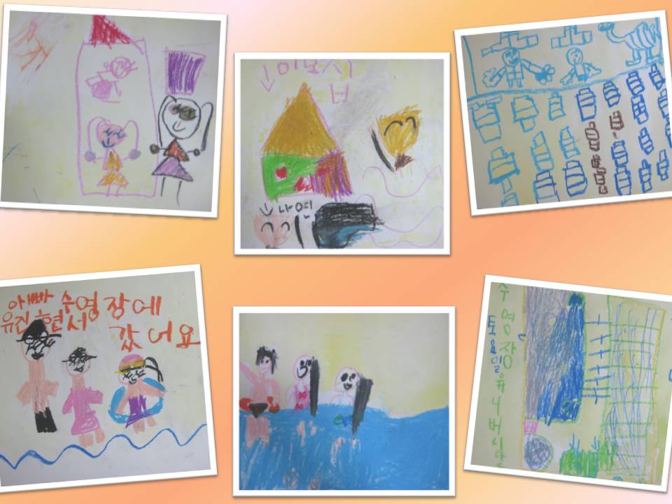 유아: 방학 때 엄마랑 아빠랑 동생이랑요. 식당에가서 맛있는 것도 많이 먹고 밖에 분수대 가서 물놀이도 했어요. 내 친구도 갔는데요. 내 친구는 분수에서 넘어져서 바지가 다 젖었어요. 분수물이 엄청 시원해서 내 몸도 시원했어요.