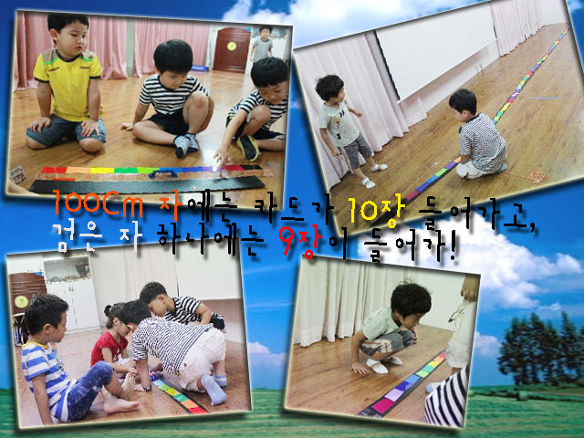 - 아직은 상징적 표상을 통한 연산이 어려운 우리 아이들에게 10Cm 단위로 잘라 만든 색깔 카드를 제공해 보았습니다. 아이들은 80장의 카드를 세어보고는 더 큰 숫자도 셀 수 있다며 숫자세기 게임을 해보기도 합니다.유아1: 1.../ 유아2: 130/ 유아3: 131/ 유아4: 진짜 많다. 이러다가 1000까지도 세겠다! - 큰 수 까지 세기가 가능해진 아이들에게 어쩌면 더욱 쉽고 재미있는 연산방법을 알아갈 수 있을 것 같아 연산 방법을 바꿔보기로 합니다.