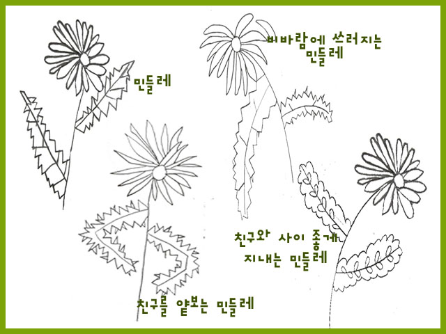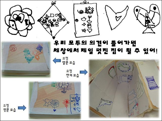 <친구>팀은 동화에 등장하는 주인공을 디자인합니다. T:동화 속에 나오는 민들레는 어떤 친구지? C:겉모습은 너무 예뻐요. C:그런데 마음은 너무 고약해요. T:그런 민들레의 모습은 어떻게 나타내면 좋을까? C:꽃잎의 끝을 뾰족뾰족하게 그려요. T:왜? C:끝이 뾰족뾰족하면 더 나쁘게 보이잖아요. T: 잎에는 가시도 달아요. C:더 나빠보이게. C: 그리고 잎은 화가 난 것처럼 꺾어요. C:하지만...민들레는 나중에 착한 친구가 되잖아. T:다시 마음이 착해진 민들레는 어떻게 표현하지? C:동글동글하게...그러면 착한 친구처럼 보여. C:그리고 가시도 점점 없애고. 동화 속 주인공의 마음의 변화를 민들레 꽃잎과 잎을통해서 표현하고 이야기 나눈 것을 그림으로 나타냅니다.# <물고기집>팀이 바다처럼 꾸며 주는 것에 대해 이야기를 나누어 보았습니다.