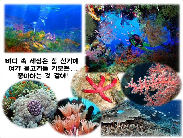 T: 바다 속을 어떻게 꾸며 줘야 해? C: 종이에 붙여서? C: 그러면 물속에 들어가면 찢어지잖아. C: 플라스틱 같은데 꾸며 주는 거야. C: 그러다가 다치면 어떡할래. 그냥 진짜 조개랑 넣어주면 되잖아. T: 어항이 바다처럼 크지 않는데, 작은 어항 안을 바다처럼 꾸미려고 무엇을 넣어야 한다면 딱 한 가지 어떤 것을 넣고 싶어? C: 조개. C: 불가사리. C: 소라. C: 다른 물고기, 지느러미가 팔랑팔랑 한 걸로... C: 소금! 바다엔 짠 소금이 있잖아. C: 돌맹이나 해초도 넣고 싶어!