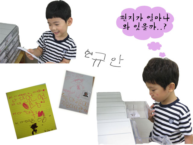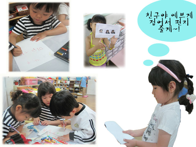새싹반 편지 영역에 나만의 <편지함>이 생긴 이후로 편지쓰기가 활동이 활발히 일어나고 있습니다. 내 편지함에 편지가 얼마나 와 있을까..? 누가 나한테 편지를 보냈을까..? 하는 기대감을 가지고 편지함을 열어보기도 합니다. 유아1: 어제 유치원에 안 왔는 친구한테 편지 쓰고 있어요. 교사: 왜 그 친구한테 편지를 써요? 유아2: 그 친구가 보고 싶어서요. 유아3: 선물도 만들고 있어요. 선물을 받으면 좋아할 거 같아요. 유아들은 어제 유치원에 오지 못한 친구에게 쓴 편지와 선물을 친구의 편지함에 몰래 넣어둡니다. 유아4: 나 편지 받았어요~ 친구가 나한테 편지 썼어요. 하늘만큼 기뻐요!유아들에게 편지함은 다 표현하지 못한 내 마음을 전할 수 있는 도구가 되기도 하고 친구를 행복하게 해 주는 통로가 되기도 합니다. 유아5: OOO한테 편지 써야지! “친구야 사랑해 라고 써주세요.” “OOO 이름 써줘.” 유아들은 자신이 쓰지 못하는 글자를 교사에게 또는 친구에게 부탁하기도 합니다. 그리고 글자를 쓰기 힘든 친구들은 그림, 사진을 붙여가며 자신의 마음을 전하기도 합니다.