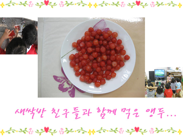 “앵두 먹어봐요~” “엄마가 앵두 먹어도 된다고 했어요.” 예쁜 앵두를 입으로 쏘옥~먹어 본 후 아이들의 이야기를 들었답니다.“윽~ 새그러워.” “난 달콤한데~ 또 먹고 싶어요.” “또 주세요.!!” “씨가 있어요. 난 씨 먹었는데..” “씨 먹어도 괜찮다. 똥으로 쑥 나온다.” “아니면 앵두 먹고 오글오글 하다가 씨만 밷아내면 된다.” 나무에서 열리는 열매에 관심을 가지고아이들이 직접 따서 열매를 먹어보는 경험을 해 보았답니다. 자연이 주는 신비함을 알고 앵두를 관찰하면서 새로운 경험을 해보는 시간 이였답니다.