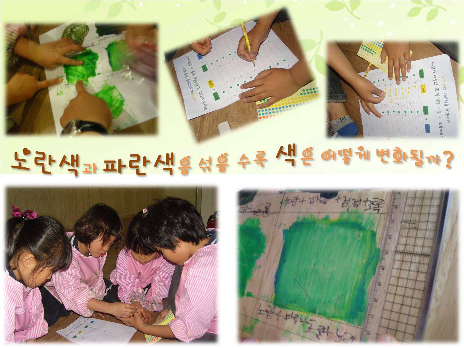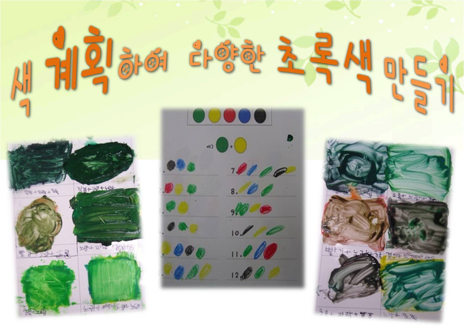 색 탐색에 참여하는 유아들과 함께 좀 더 다양한 초록색을 만들기 위해 색에 대한 계획을 세운 후, 색 섞기를 해 봅니다. “선생님, 이거랑 이것 둘 다 초록색이랑 노란색 섞었는데 색이 달라요.” 유아들은 같은 색을 섞었는데도 색이 다르게 나온 것을 보며 호기심을 느낍니다. 유아1: 물을 많이 넣어서 그런가? 유아2: 한쪽은 노란색 물감이 많이 들어가고 한쪽은 조금만 들어가서 그런 것 아니야? 교사: 노란색 물감이 더 많이 들어가서 그런 거라면 어느 쪽에 더 많이 들어 간 것 같아? 유아들은 색이 더 연한 쪽을 가리킵니다. 교사: 그럼 초록색이 진해지려면 어떤 색을 섞어야 해요? 유아3: 남자색이요! 진한색은 넣으면 넣을수록 색이 진해질 것 같아요. "궁금해요! 초록색 물감에 노란색 물감이랑 진한색 물감이랑 섞으면 색이 어떻게 변화되는지 한번 실험해 봐요!"