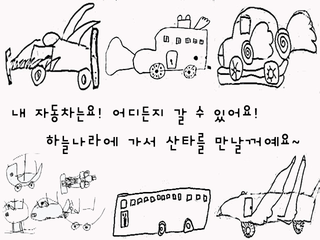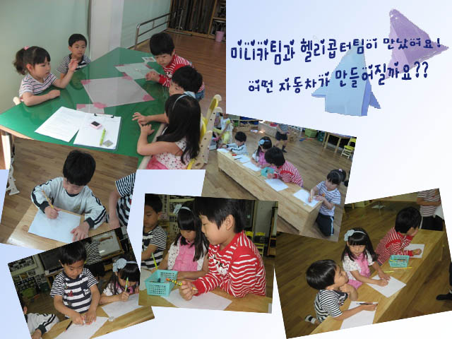 “색종이가 아닌 다른 매체로 자동차를 만들어 보면 어떨까?”라는 가설에서 시작된 자동차 만들기. 유아들은 어떤 자동차를 만들고 싶은지 나눔시간에 생각을 나누어 봅니다. 유아: 경주용차요! 그걸로 미니카 시합했으면 좋겠어요~ 유아: 나는 그냥 평범한 자동차! 유아: 아빠 차요! 우리아빠차가 제일 멋져요~ 유아: 나는 하늘을 나는 자동차요! 유아: 그러면 날개도 있어야 겠다. 유아3: 로봇차! 변신도 할수 있고! 진짜 멋있겠다~ 유아2: 나는 어디든지 갈 수 있는 자동차를 만들었으면 좋겠어요~ 외국도 갈 수있구요~ 유아: 나는 산타할아버지한테 가고싶은데... 유아: 산타할아버지한테 가려면 썰매있어야 겠다. 눈이 있으니까! 유아: 불을 달아서 눈을 녹이면서 하면 좋겠다! 유아: 포크레인으로 눈을 다 푸자! 유아: 눈을 먹는 기능이 있으면 재미있겠다. 유아들은 자신의 생각을 표현하고, 더 좋은 생각들을 나눔으로써 생각이 더 풍부해 집니다. 나눔시간에 이야기 한 내용과 자신의 경험을 더해 유아들은 첫 번째 자동차 그림을 그립니다. 하늘나라로 갈 수 있게 날개가 달린 자동차, 눈이 많이 오는 나라에 살고있는 산타할아버지를 만나러 가기위해 눈치우는 기계가 있는 자동차, 물 위에도 뜰 수 있는 보트가 달린 자동차, 자동으로 변신할 수 로봇차. 유아들은 저마다 재미있는 생각과 아이디어를 담아 자동차를 표현합니다. 미니카 시합을 하면서 자동차의 기능적인 면에서 지식을 가지고 있는 미니카팀과 헬리콥터를 만들며 여러 가지 매체를 경험해보고, 시행착오를 겪어온 헬리콥터팀이 만나 어떤 멋진 자동차를 만들어가게 될지 기대되지 않으세요?