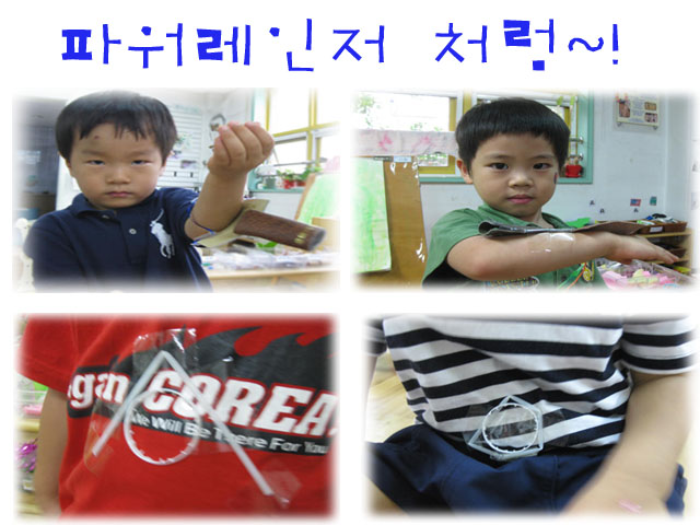 요즘 만들기 영역에서는 파워레인져의 상징물을 흉내 내는 많은 작품들을 만들고 있습니다. 실제 파워레인져의 무기나 상징물은 몸에 붙어있고 새싹반 유아들은 그 것을 모방하기 위해 피부에 테이프를 붙이며 상징물을 붙입니다.