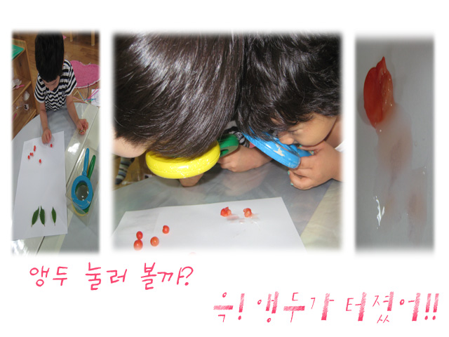 아이들의 연구를 지원해 주기위해 앵두 열매를 따서 관찰영역에 놓아두었답니다.