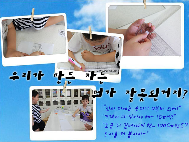 - 각자가 만든 자의 문제점을 깨달은 비행기 연구팀은 다시 힘을 모아서 종이를 길게 잇고, 1Cm씩 간격을 맞추며 긴 자를 만들어봅니다.