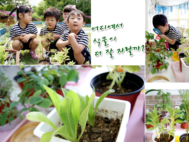 이야기 끝에 어린이들의 의견은 두 가지로 나누어졌습니다. 하늘반에 있는 식물이 더 잘 자랄 것 같다는 의견과 유치원 뜰에 있는 식물이 더 잘 자랄 것 같다는 의견으로 말입니다. 그래서 우리는 하나의 화분을 가지고와 하늘반에 두고 유치원 뜰에 있는 식물과 비교하며 관찰해보기로 했습니다. 서로 다른 환경에 있는 식물을 관찰해보면서 식물이 자라기 위해서는 어떤 것들이 필요한 지 알아갈 수 있지 않을까요?