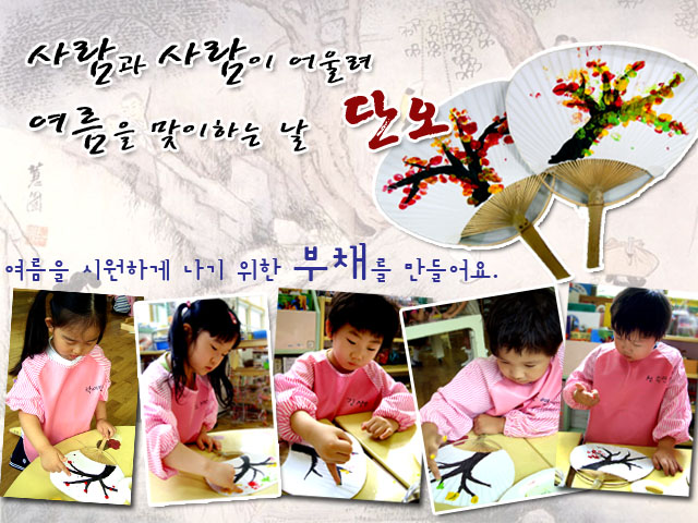 단오는 봄이 가고 여름이 다가오면서 계절적인 악성유행병이 돌게 되는데 이를 예방하기 위한 여러 가지 행사의례가 이루어지는 날이라고 합니다. 우리나라 명절인 단오의 의미를 알아보기 위해 어린이들과 함께 단오의 풍속을 경험해보았습니다.
