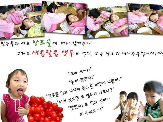 유치원 뜰에 있는 앵두가 맛있게 익었습니다. 깨끗한 물에 씻은 후 하늘반 친구들과 나누어 먹었지요. “앵두가 새콤달콤해요.”, “빨간앵두가 정말 예뻐요.”, “한림유치원 앵두나무에서 나온 앵두라서 더 맛있어요.” 사람과 사람이 어울려 여름을 맞이하는 즐거운 명절인 단오. 하늘반 친구들도 함께 어울려 여름을 맞이하였답니다. 친구들의 서로를 생각하는 마음 덕분에 올 여름은 아프지 않고 건강하게 지낼 수 있을 것 같습니다.^^