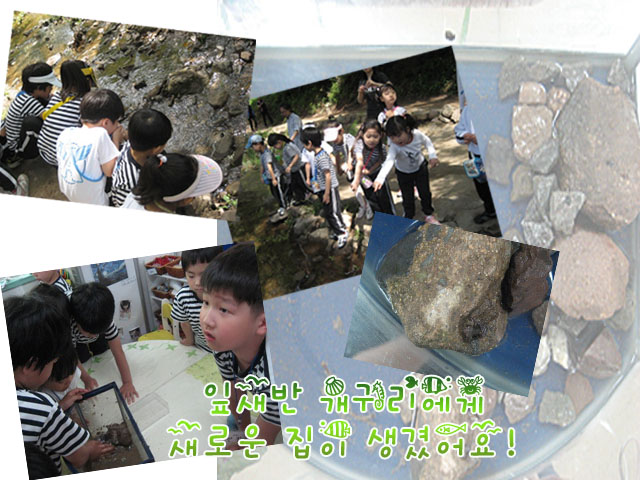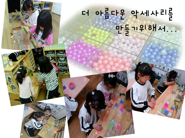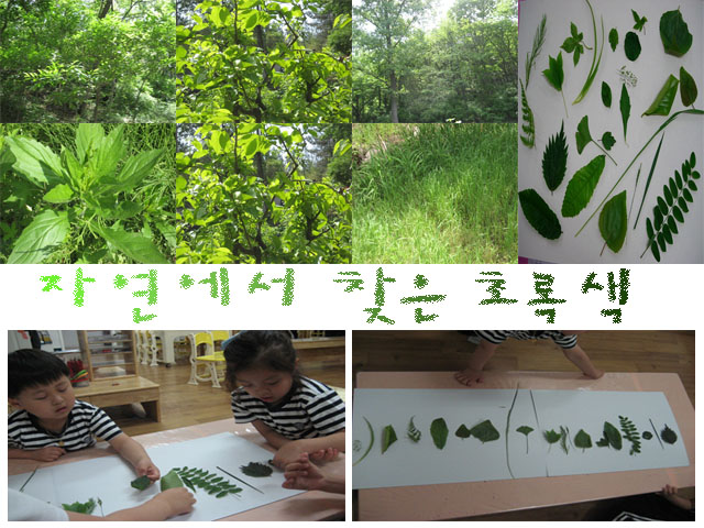 <새로운 개구리 집> 개구리에게 연못 같은 환경을 꾸며주기로 한 잎새반 유아들은 함지산 등반을 하며 수조에 넣을 적합한 돌과 식물을 구해옵니다. 구해온 돌과 나뭇잎, 그리고 모래를 수조에 넣기 위해 깨끗이 씻어서 준비합니다. 수조에 돌을 깔고 모래를 넣으려는데, 물에 젖은 모래를 넣다가 수조가 엉망이 되어버립니다. “모래 대신 작은 돌을 넣으면 되겠어요. 그러면 그 작은 돌을 밟고 개구리가 점프할 수 있잖아요.” 유아들은 흙이 담긴 수조를 씻어내고, 수조바닥에 작은 돌을 깐 뒤 큰 돌을 그 위에 올린 후, 물을 담습니다. 그렇게 해서 올챙이와 개구리가 함께 살아갈 수 있는 환경이 만들어 집니다. 개구리는 잎새반 친구들이 꾸며준 새로운 집이 마음에 들까요? “개구리야~ 잎새반에서 행복하게 오랫동안 같이 살자~”<악세사리 만들기> 매일 똑같은 방법으로 악세사리를 만들던 유아들은 매듭짓기가 힘들어 여러 가지 방법을 시도하던 끝에 양면테이프와 찍찍이를 이용하여 악세사리 만드는 방법을 찾게 됩니다. 유아들은 리본 끈에 양면테이프를 붙이고 그 위에 여러 가지 구슬을 붙인 뒤 찍찍이로 양끝을 붙이면 손쉽게 목걸이와 팔찌를 만들 수 있다는 것을 알아냅니다. 그런데 어느 날 하나둘 떨어지는 구슬들... 유아1: 구슬이 동그래서 양면테이프에 닿는 부분이 적어서 그런 것 같아요. 유아2: 먼지 때문에 끈적끈적한 부분이 없어져서 자꾸 떨어지는 것 같아요. 유아들은 문제점을 느끼고 계속 보존 할 수 있고, 좀 더 멋진 악세사리를 만들기 위해 고민을 하게 됩니다. 잎새반 유아들은 앞으로 어떤 방법으로 멋진 악세사리들을 만들어 나가게 될까요?<다양한 초록색을 찾아서...> 다양한 물감을 섞어 보며 섞는 물감에 따라 변화하는 색에 관심을 갖지게 됩니다. 그러면서 잎새반 하면 생각나는 <초록색>을 만들어보려는 시도를 해 봅니다. 우리 주변에서 볼 수 있는 초록색이 다 같은 초록색이 아니라는 것을 인식하면서 유아들은 초록색 계열의 다양한 색을 만들어 보기 위해, 유아들은 먼저 초록색 물감을 짠 후, 노란색, 빨간색, 파란색, 검정색 등 다양한 색의 물감을 섞어 색의 변화를 탐색합니다. 유아1: 초록색에 노란색을 넣으니까 점점 연한 연두색이 되고, 초록색에 파란색을 섞으니까 점점 진한 초록색이 되어요. 꼭 청록색 같아요. 유아들은 초록색 물감을 기준으로 다양한 색을 섞으며 섞는 색이 달라짐에 따라 변화하는 다양한 초록색을 보며 신기해 합니다. 우리 주변에는 얼마나 다양한 초록색이 존재할까요?