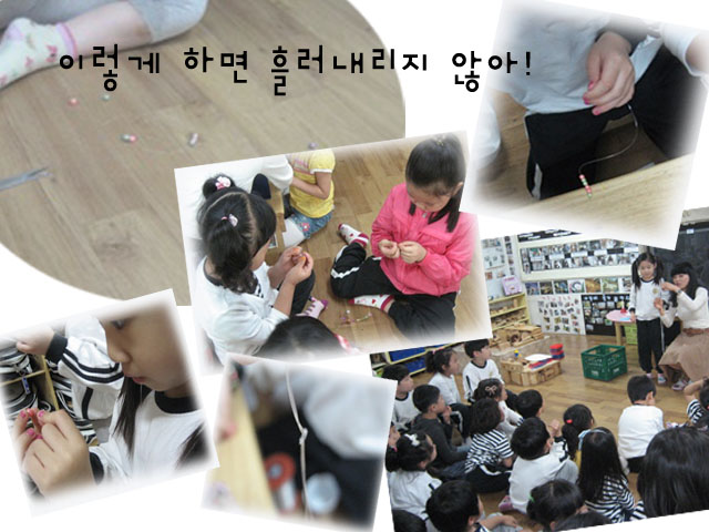 “나도 이렇게 예쁜 목걸이 만들어 보고 싶어요!” 유아들은 사진 속 목걸이를 보고, 재료를 가져와 목걸이를 만들기 시작합니다. 그런데 자꾸만 낚시줄에서 흘러내리는 구슬 때문에 유아들은 힘들어 합니다. 구슬을 어떻게 하면 안 흘러내리고, 구슬을 잘 꿸 수 있을지에 대해 나눔시간에 이야기를 나누어 봅니다. 유아1: 둘이서 잡고 하면 되잖아! 유아2: 친구가 하기 싫다고 하면 어떻게 해! 유아3: 그럼 입으로 잡고 하면 안돼? 유아4: 끝을 묶으면 될 것 같은데? 유아5: 그래도 흘러 내릴껄? 낚시줄은 미끄럽기 때문에 흘러내려... 유아6: 작년 꽃잎반 때는 바닥에 테이프를 붙여서 했는데 잘 됐었어! 유아들은 각자의 방법들로 문제를 해결할 수 있는 방법을 알려 줍니다. 다음 날 유아들은 친구들이 피드백 해준 방법들을 생각하며 목걸이를 만들고 서로의 목걸이에 대해 평가하는 시간을 갖습니다.