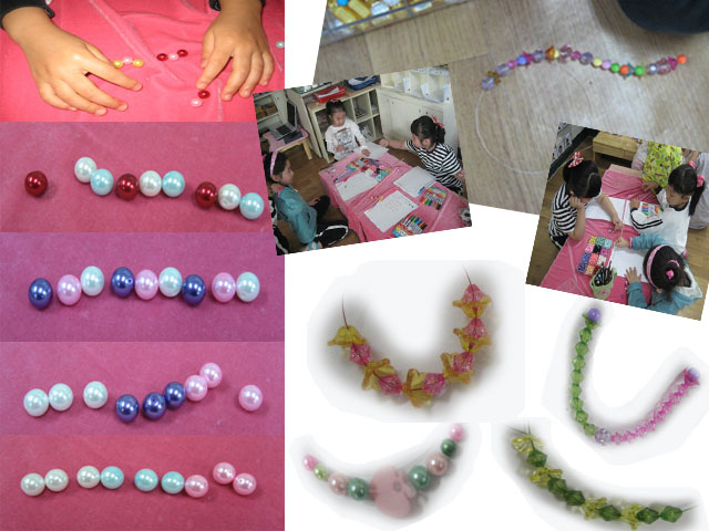 유아7: 이것저것 너무 많이 끼운 것 같아서 어지러워. 유아8: 예쁘긴 한데, 이 부분이 이쪽으로 옮겨지면 더 예쁠 것 같아. 유아9: 맞아. 양쪽이 같으면 더 예쁠 것 같아. 유아10: 색도 같으면 예쁘겠다. 유아들은 비평적 읽기를 통해 반복되는 규칙이 있으면 더 멋진 악세사리를 만들 수 있을 것이라고 의견을 모읍니다. 이를 토대로 유아들은 규칙을 생각하며 여러 가지 방법으로 구슬을 놓아봅니다. 유아들은 기준점에서 양쪽에 구슬을 대응되게 놓아 보기도 하고 반복되는 일정한 규칙을 갖고 구슬을 꿰어 보기도 합니다. 앞으로 유아들은 얼마나 다양한 방법과 패턴을 이용하여 목걸이를 만들어 나가게 될까요?# 자연의 색 만들기