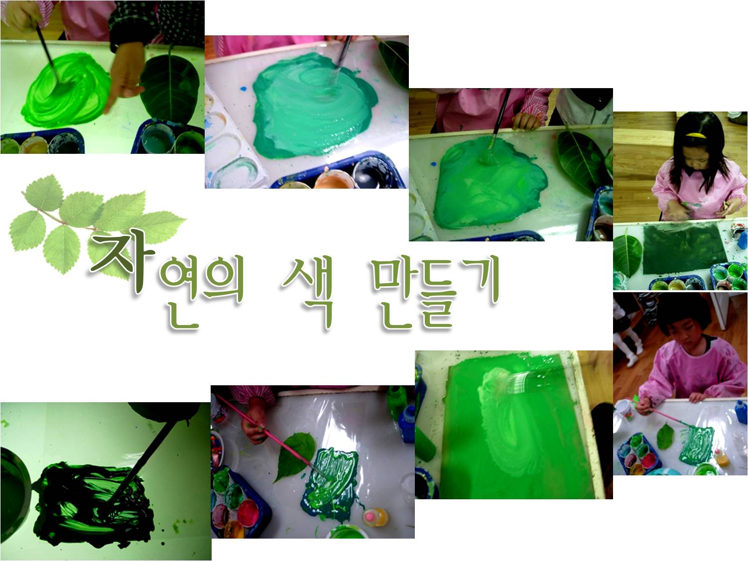 “나뭇잎 색깔을 물감으로 한번 만들어 보고 싶어요.” 이전에 여러 초록색을 섞어 색을 만들어 본 경험이 있는 유아들은 자연의 색을 물감으로 만들어 보기에 도전 합니다. 연한 빛깔의 나뭇잎을 표현하기 위해 연두색 물감으로 색을 낸 후 색을 좀 더 진하게 만들기 위해 초록색, 파란색을 넣어 색을 섞어 보기도 하고, 또 다른 짙은 색의 나뭇잎을 표현하기 위해 초록색 물감에 빨간색, 검정색 등의 색을 섞어가며 나뭇잎과 비슷한 색을 만들어 갑니다. “나뭇잎 색 만드는 것 진짜 어렵다.”, “비슷한 색은 만들었는데 똑같은 색을 만드는 건 어려워요.” 이전에 초록색을 만들기 위한 여러 시도들을 통해 다양한 초록색 만들기를 경험해 보았지만 자연의 색과 같은 색을 만들어 내기란 결코 쉽지 않은가 봅니다. 유아들은 자연의 색과 유사한 색을 만들기 위해 다양한 시도들을 해봄으로써 어떤 색을 섞느냐에 따라 색이 진해지고 연해질 수 있는지를 경험하게 됩니다.