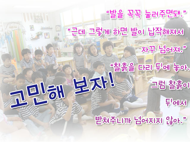 친구들의 의견을 수용하고 자신의 초기의 계획과 시도를 더욱 정교하게 다듬어간 결과 ‘찰흙으로 만든 사람’을 세우는 것에 성공하게 됩니다. 혼자서 문제를 해결하려고 할 때는 막연하고 어려웠지만 친구들의 이야기를 들어보고 의논하는 과정을 통해 새로운 생각과 다양한 방법들을 알아 가게 되는 것입니다.