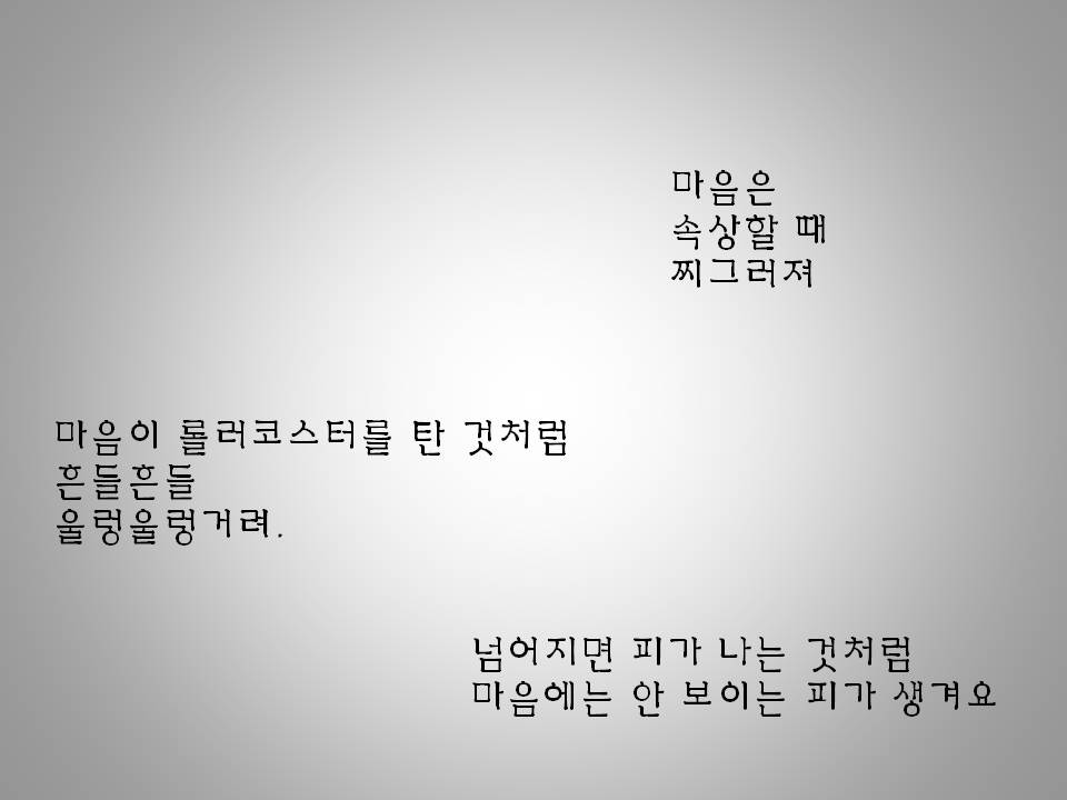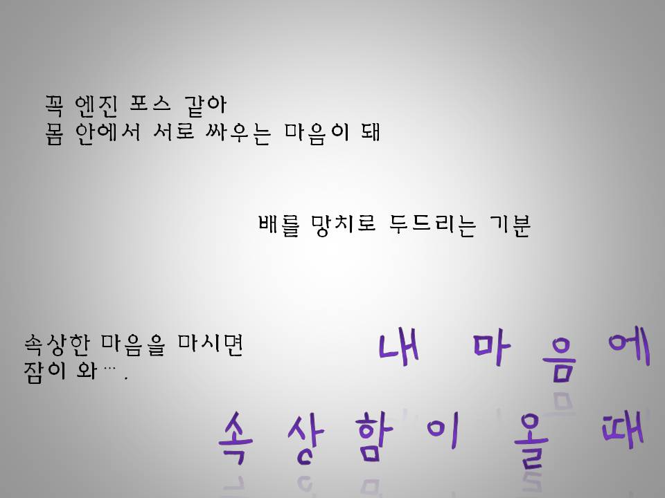 나는요. 이 세상에 태어나서,,여섯 살 될 때 까지 제일 속상한 일이 있었어요. 혼자 자전거 타고 있었을 때...아빠하고 엄마하고 동생은 안 나오고 그냥..내 혼자만 놀아서..놀이터에 친구들도 아무도 없구요. 그때 심심했어요. 꼭 엔진 포스 같이.. 몸 안에서 서로 막 싸우는 마음이 됐어요. 나는요. 엄마가요. 아빠랑 싸울 때..아빠가 인터폰 깼을 때..나를 아프게 하지는 않았는데 싸우니까 ...꼭 해머 같았어요. 망치로 때리는 것 같았어요. 배를 망치로 두드리는 것 같은 기분이였어요. 나는 미술 수업하는데 동생이 건드려서 자꾸 글자가 이상하게 되는 거예요. 아주 큰 도끼로 마음을 퍽 때리는 것 같았어요. 나는 놀고 있는데 엄마는 조금만 놀고 치우라 해서 그때 속상했어요.나는 잠 깨울 때가 제일 속상해요. 할머니가 깨우니까..몸 속에서 파워레인져가 서로 싸우는 느낌이예요. 너무 잠이 와요 너무..