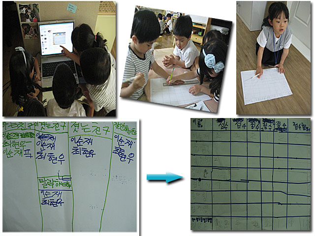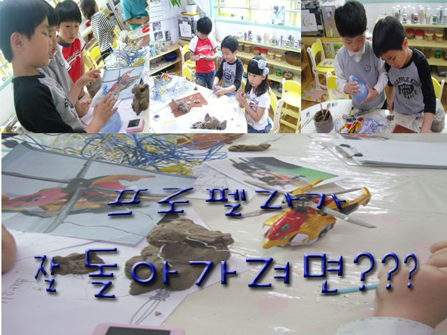 <트리콥터> 집에서 가져온 실제 트리콥터! 유아들은 자신이 그린 설계도와 비교하며 부족한 부분을 보태어 봅니다. 그렇게 완성된 설계도를 보며 트리콥터를 만들 매체를 찾아 보던 중 눈에 들어온 “찰흙!” 유아들은 역할을 분담하여 가변성을 지닌 찰흙으로 트리콥터의 각 부분을 만들어 봅니다. “선생님, 프로펠라 안돌아가요~” 프로펠라를 만들던 중 문제에 부딪히게 됩니다. 유아1: 뱅뱅이가 있으면 되는데~ 뱅뱅이 사면되겠다! 유아2: 진짜 트리콥터에는 자석이 있어서 돌아가! 유아3: 철사를 꽂아서 돌아가게 하면 되지. 친구들의 의견 중에 철사를 이용하여 프로펠라를 만들어 봅니다. 그런데, 매번 찰흙이 굳어져 물을 뿌려야만 돌아가는 프로펠라! 잘 돌아가는 프로펠라를 만들려면 어떤 방법이 필요한 걸까요?<미니카 시합>미니카 시합에 심판으로 참여하고자 하는 유아들이 늘어남으로 또 다시 점수를 나타내는 방법에 갈등을 느끼게 됩니다. 이번에는 미니카 시합에서 1등한 친구의 이름을 점수판에 적어 이름이 가장 많은 순으로 순위를 매기는 방식으로 점수를 나타냅니다. 그러나 이 기록 방법은 친구의 이름을 일일이 세어야 하는 불편함이 있어 유아들은 점수를 나타낼 수 있는 다른 방법을 찾게 됩니다. “농구경기 때 사용하는 점수판은 안되겠어. 우리는 팀전이 아니라 개인전이잖아.”, “볼링점수판 같은 거면 좋겠어. 이름도 있고, 점수도 적을 수 있고!” 유아들은 이름과 점수, 합산한 점수를 나타낼 수 있도록 하기 위해 표를 만들어 점수를 나타내게 됩니다. 표를 만들어 나타내는 점수판은 점수를 계산하고 순위를 알아보는데 효과적일까요?<올챙이의 변화>