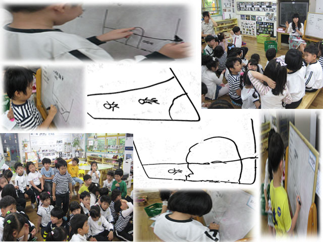 “선생님, 올챙이 뒷다리 났어요!”, “어? 이제 앞다리도 생겨 났어요.” 교사: 올챙이가 개구리로 점점 변화되고 있는데 어떻게 도와주면 좋을까? 유아1: 돌이 있어야 해요. 개구리가 되면 위로 점프해서 올라갈 수 있어야 하거든요. 유아2: 올챙이는 꼬리가 있어서 헤엄을 잘 치지만 개구리는 꼬리가 없어서 다리로 헤엄쳐야 하기 때문에 다리에 힘이 떨어지면 헤엄을 못쳐서 죽을 수도 있어요. 유아5: 돌은 물 위로 올라와야 할 것 같아요. 물 속에 잠겨 있으면 개구리가 올라와서 숨을 쉬기가 힘들잖아요. 유아6: 너무 가파르면 미끄러져서 안될 것 같아요. 개구리가 미끄러지지 않고 잘 쉴 수 있으려면 평평한 돌이 필요해요. 유아4: 연못처럼 꾸며야 할 것 같아요. 개구리는 원래 연못에 사니까 연못처럼 꾸며주면 개구리가 자기가 원래 살던 집이랑 비슷해서 더 잘 살 수 있을 것 같아요.