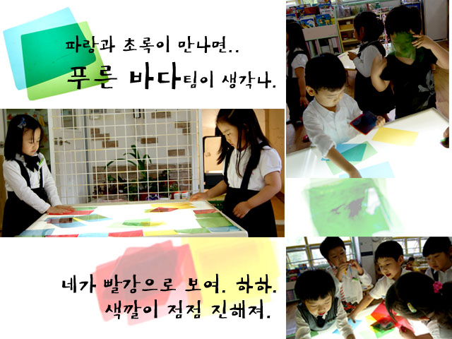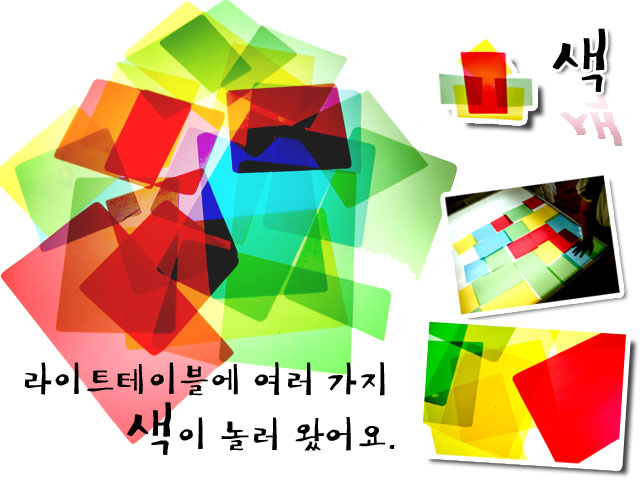 따라서 저희들은 어린이들이 색을 더 잘 인식하고 색을 보며 더 많이 느끼면서, 색이라는 것이 어린이들의 삶에 기쁨과 활력을 주는 요소로 다가가기를 기대하며 라이트테이블 위에 셀로판지를 지원하였습니다.
