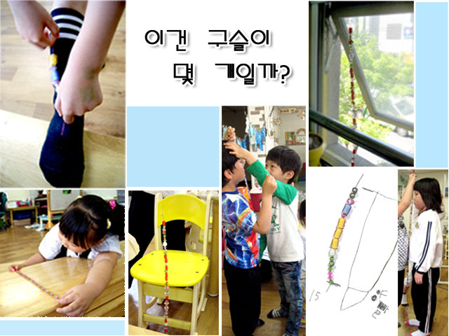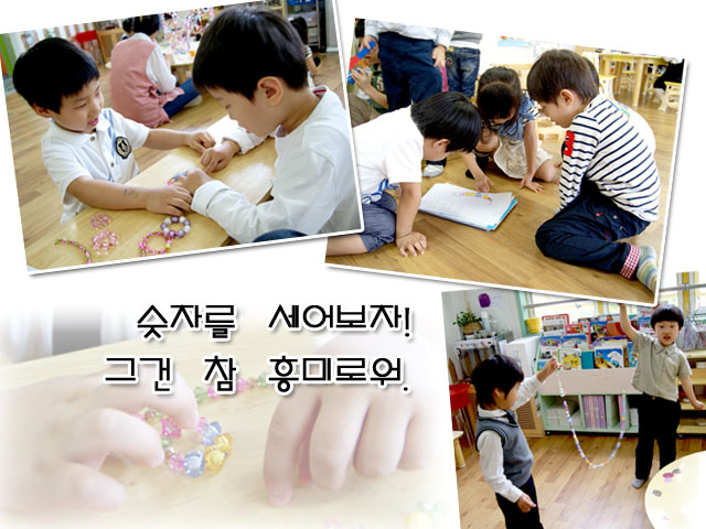 “난 진짜 길게 만들어야지~” “난 내 키만큼 만들었다~” “우와~ 진짜 길다! 그건 몇 개야?” “이거?? 1, 2, 3, 4, .... 133~! 133개. 내 키는 구슬 133개다.” “우와~~~ 진짜 많다. 100보다도 더 많다.” “나도 길게 해야지~!”