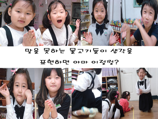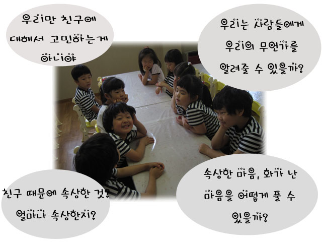 #<친구>팀은 지금까지의 만남을 통해 친구에게 속상했던 것, 친구와 함께여서 즐거웠던 것 등 <친구와의 관계, 그 때의 내 마음을 은유적으로 표현>해 보았습니다. T:그런데 우리의 이런 경험은 과연 우리들만의 이야기일까? C:아니에요. 할머니도 친구랑 싸워요. C:선생님도 싸우잖아요. T:우리가 이렇게 모임을 가지고 이야기를 나누는 것이 그 사람들에게 무언가 도움이 될 수 있을까? C:우리가 말을 들어주면 속상한 마음이 풀릴거에요. C:이런 마음이 들 때 어떻게 해야 되는지를 알려줘야 할 것 같아요. C:방법을...