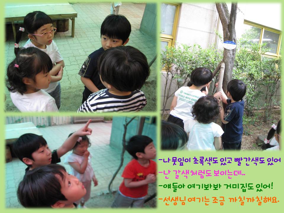 유아: 동물도 있어야 해요. 옆에서 나무가 힘들면 봐주고 동물이 나무 봐주는게 힘들면 우리가 사랑해줘요.햇살반나무를 정하기 위해 유치원 마당으로 가서 찾아봅니다. 나무 아래에 쉴 수 있는 의자와 잎이 많은 나무, 그리고 자두를 먹을 수 있는 ‘자두나무’로 결정!