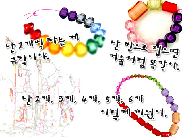 하늘반에 다양한 색과 모양을 가진 구슬을 새로운 매체로 지원하게 되었습니다. 처음에는 단순히 구슬을 끼우는 것에 관심을 가지던 어린이들이 놀이가 지속되면서 자신만의 규칙을 만들어 내게 됩니다.
