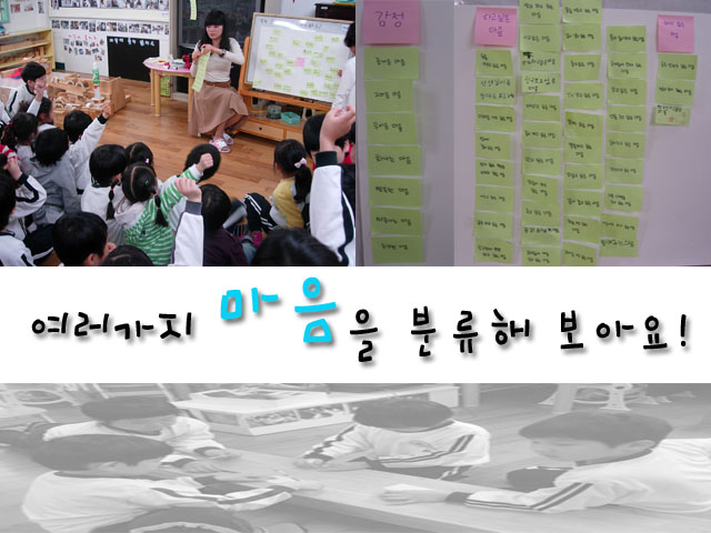 여러가지 마음이 있음을 알아본 후 비슷한 마음을 찾아 분류해 보는 시간을 가져 봅니다. 분류 기준을 감정, 하고 싶은 것, 하기 싫은 것으로 나눈 후 자신들이 말한 다양한 마음들을 분류기준 안에 포함시켜 봅니다.