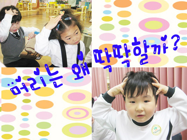 유아3: 뼈다귀 때문인가? 유아4: 머리에 착한게 가득 들어 있으니깐 딱딱하지~