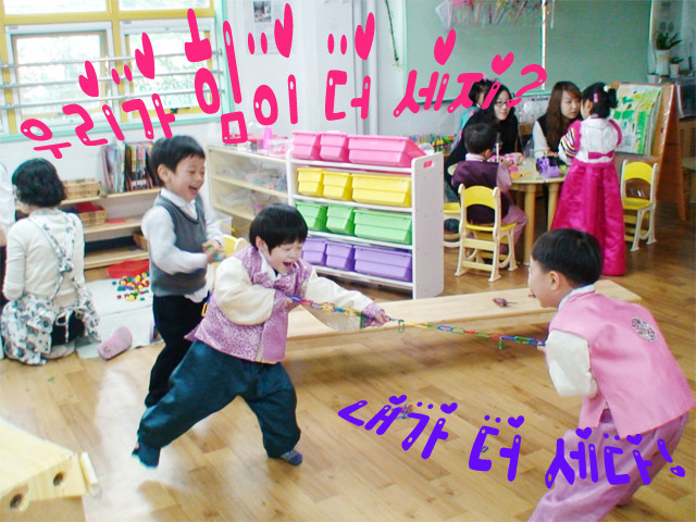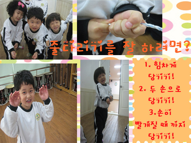 유아: 줄을 끝까지 다 당기는 팀이 승리하는 거예요. 교사: 그럼 줄 당기기를 잘 할 수 있는 방법은 뭘까? 유아1: 힘차게 당기기!! 유아2: 두 손으로 당기면 되잖아~ 유아3: 손이 빨개 질 때 까지 당기면 된다~ 과연 아이들이 말한대로 줄을 당기면 승리할 수 있을까요?