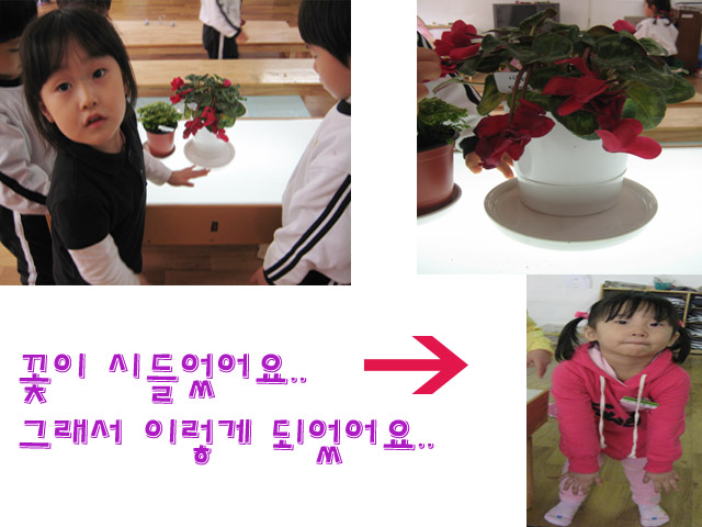 “애(꽃을 가리키며)가 밑으로 있어요.” 교사: 응. 선생님이 보기에도 밑으로 가 있는 것 같아. 원래 그랬나? “아니에요. 처음에는 이렇게(꽃을 위로 올리면서) 있었어요.”