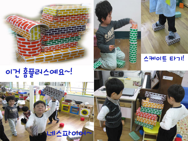 <집>을 만들기 위해 협동놀이를 하는 유아들은 블록을 건네주기도 하고 자신이 만든 부분을 뽑내기도 하며 만들기에 재미를 더 해 갑니다.