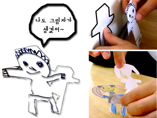 메시지방에 가위가 지원되면서 어린이들에게 또 하나의 재미있는 에피소드가 생깁니다. 반으로 접은 종이에 그림을 그린 후 그 모양을 자르니 “쌍둥이처럼” 똑같은 모양이 2개가 생긴 것입니다. 한참을 보던 어린이들은 그것을 <그림자>라 이야기 합니다. “둘이 똑같네.. 이거 그림자 같다! 그지?” 그리곤 그림자를 어디에 둘까 고민합니다. 어른들이 생각했을 때는 당연히 그림자가 사람의 발아래에 있다고 생각하지만 어린이들의 생각은 조금 다릅니다. “그림자가 앞에 있을 것 같아.” “아니다! 뒤에 있을 것 같아.” “왜? 아깐 앞이라고 했잖아!” “앞에 있으면 아닌데~ 그림자가 따라와야지... 그래서 뒤에 있어,”